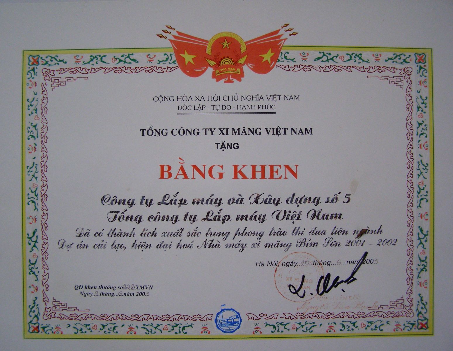 Được tặng 09 bằng khen Chính phủ, 8 năm liền từ 1998 đến nay được Đảng bộ Bỉm sơn tặng cờ Đảng bộ trong sạch vững mạnh, được UBND Bỉm sơn công nhận cơ quan văn hoá, nhiều năm liền được Tổng liên đoàn lao động Việt nam, Bộ Xây dựng tặng cờ thi đua, huy chương vàng chất lượng cao, các ngành, các cấp khác tặng nhiều bằng khen, giấy khen như Bộ Công an, Bộ Nông nghiệp & PTNN, Bộ Y tế, Tổng Công ty Xi măng việt nam ...