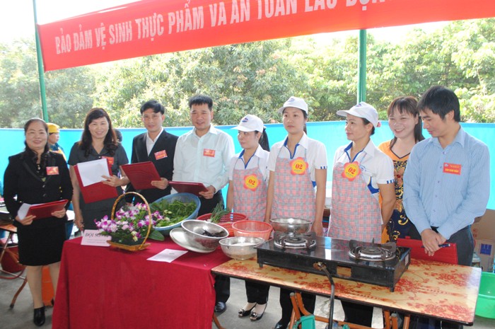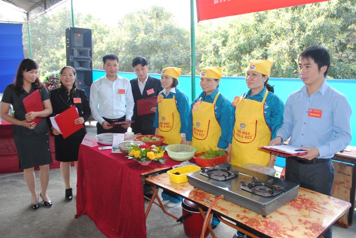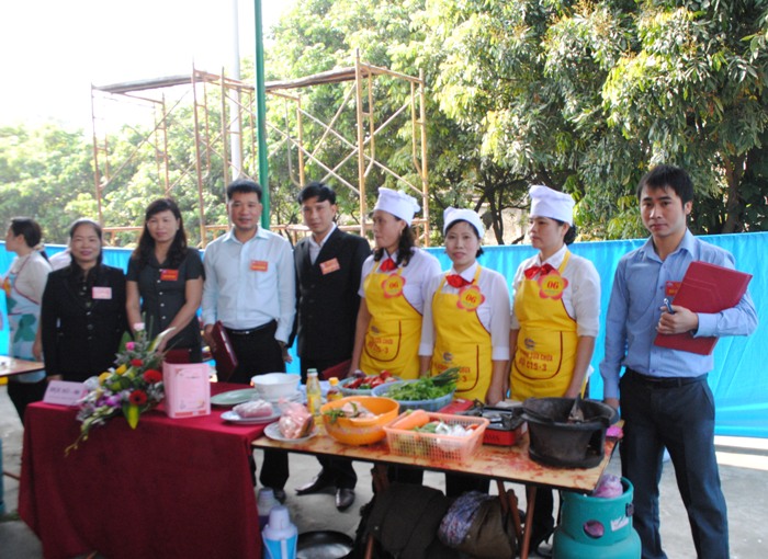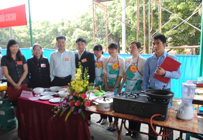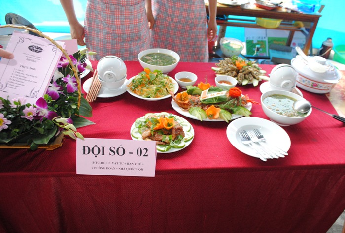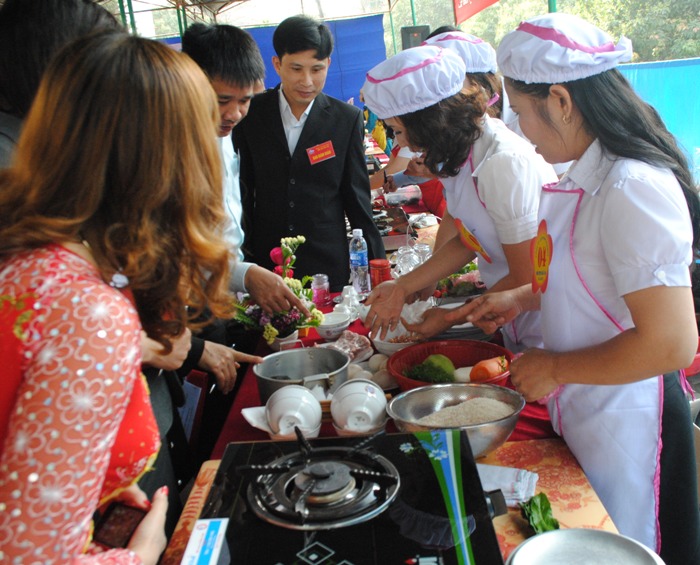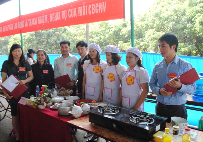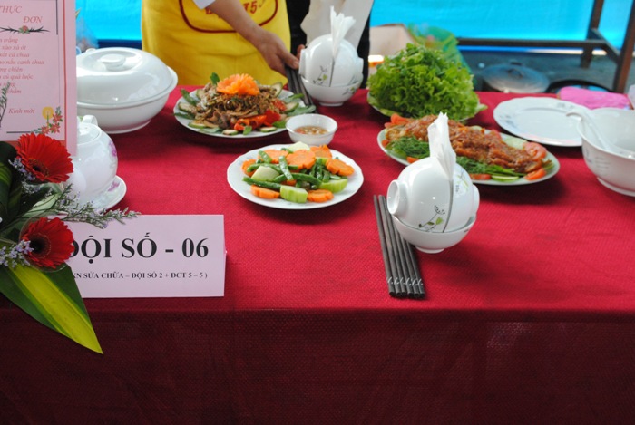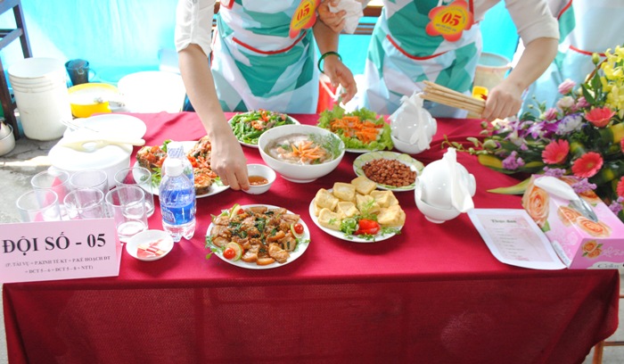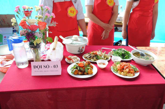 Hội thi kết thúc lúc 11h30. Sau khi công bố kết quả, tất cả những người có mặt đều đến mâm cơm từng đội để thưởng thức tài nghệ nấu nướng của các chị em.